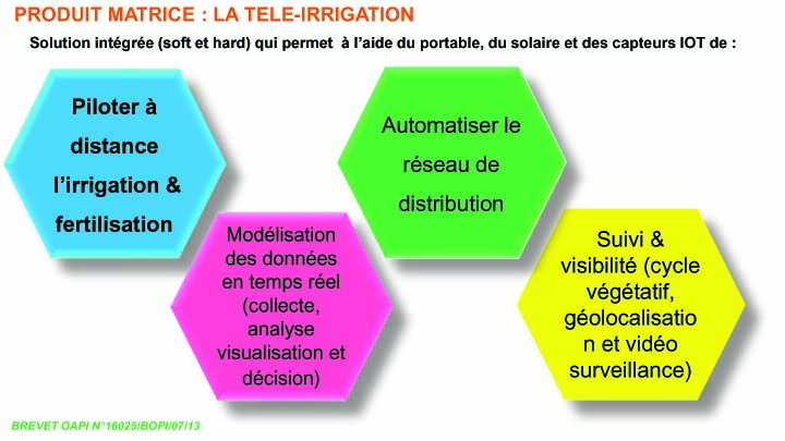 La « Télé-Irrigation » est un procédé (soft et hard) permettant le pilotage à distance du système d’irrigation d'une ferme indépendamment du temps et de l'espace via téléphone portable suivant une distribution intelligente de l’eau (besoins, quantité, temps, spéculation, cycle végétatif…) avec possibilité de collecte en temps réel des données météorologiques et hydrologiques à savoir la température, le taux d’humidité, la pluviométrie, la radiation solaire la vitesse et qualité de l’air. Ce procédé permet (i) un gain de temps et d’énergie, (ii) une augmentation de la superficie irrigable, (iii) un accroissement de la production et du revenu et (iv) une gestion maîtrisée d’eau d’irrigation.